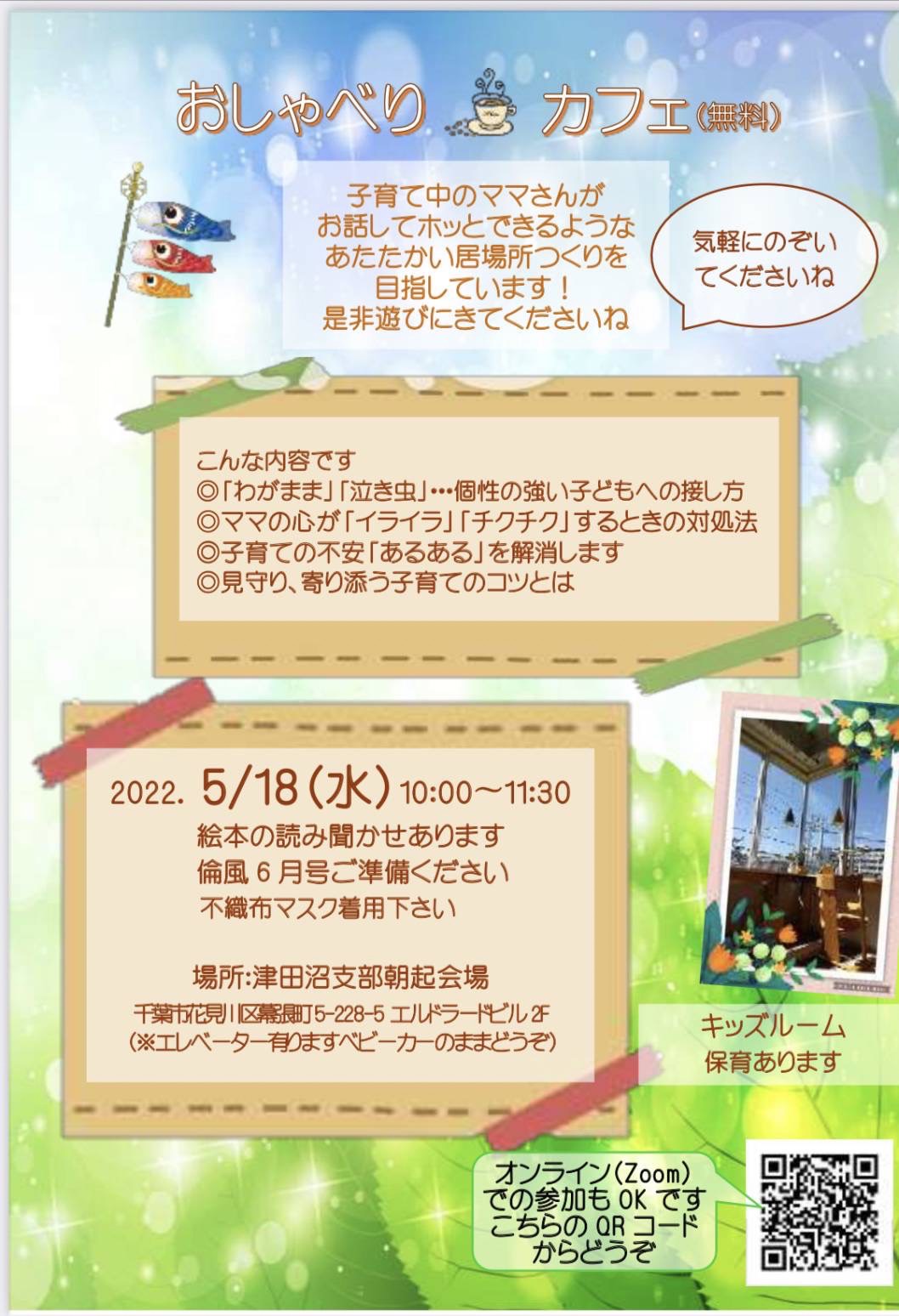 毎月1回 幕張エルドラードビル 2 階で、子育てママへ「おしゃべりカフェ(無料)」を開催しています。 子育てママさんが、お話ししてホットできるようなあたたかい居場所づくりを提供し、 地域の子育てママさんのたくさんの笑顔が地域に広がることを目指しています。